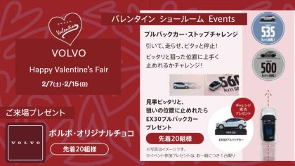 みなさま、こんにちは。ボルボ・カー岡崎です。2/7(土)~2/15(日)の期間中、* Happy Valentine’s Fair *を開催いたします。ショールームイベントといたしまして、プルバックカー・ストップチャレンジ引いて、走らせ、ピタっと停止!ピッタリと狙った位置に上手く止...