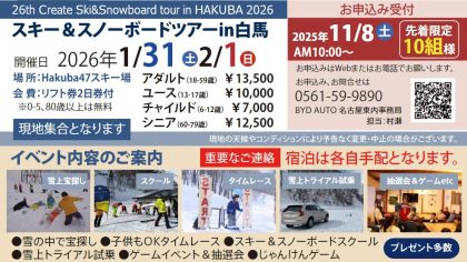 みなさま、こんにちは。ボルボ・カー岡崎です。26th Create Ski&Snowboard tour in HAKUBA 20262026年1月31日(土)、2月1日(日)スキー&スノーボードツアーin白馬開催いたします!今年でなんと26回目の開催!!今週末11月8日(土)AM10時よりご予約スタートとなります...